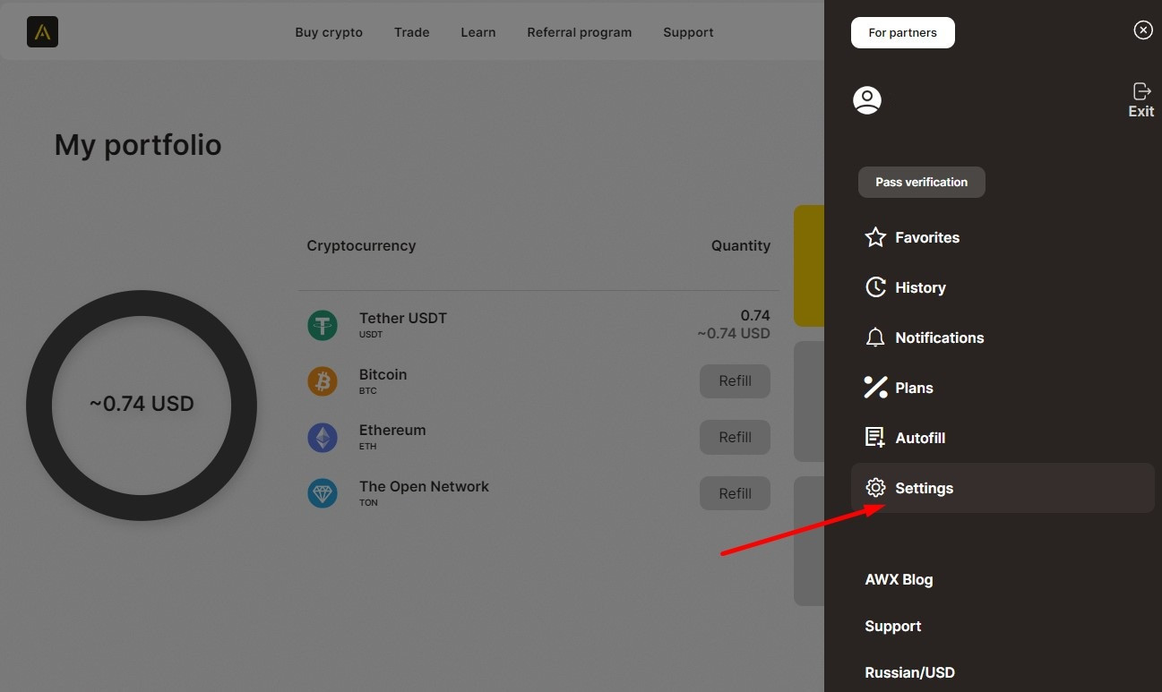 1. Register or log in to your awx.pro account. Click on the profile icon in the top right corner and select Settings.