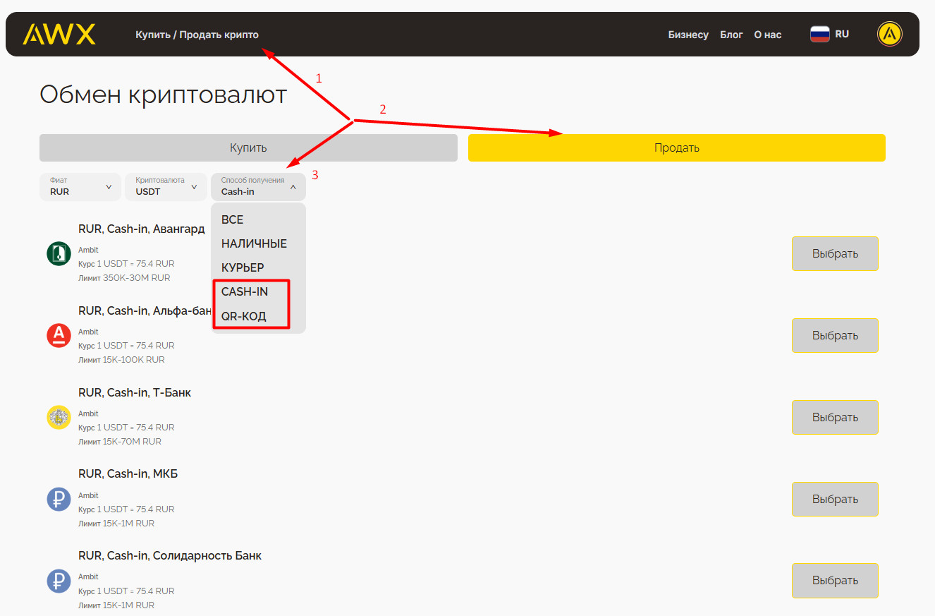 В личном кабинете откройте раздел «Продать крипто» и выберите способ получения «CASH»или QR-код.