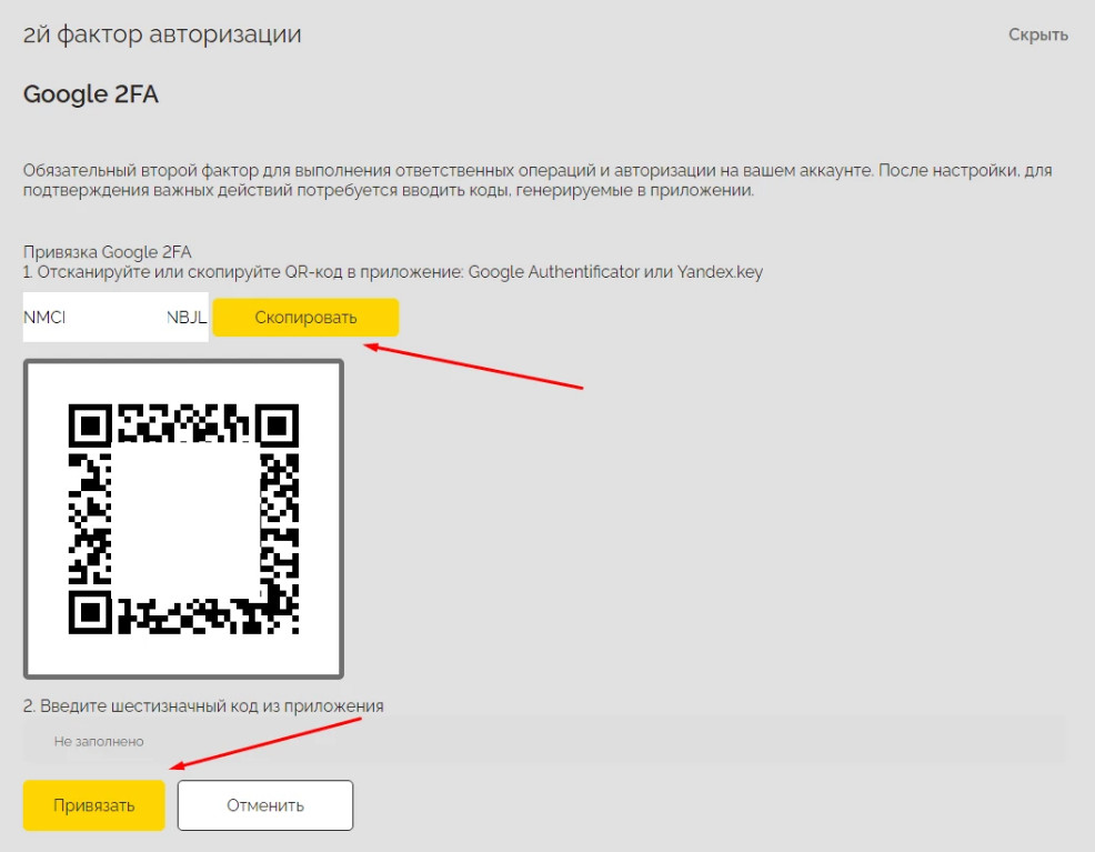 Отсканируйте QR-код. С помощью приложения-аутентификатора (подойдет Google Authenticator или Яндекс Ключ) отсканируйте код на экране или вручную введите секретный ключ.