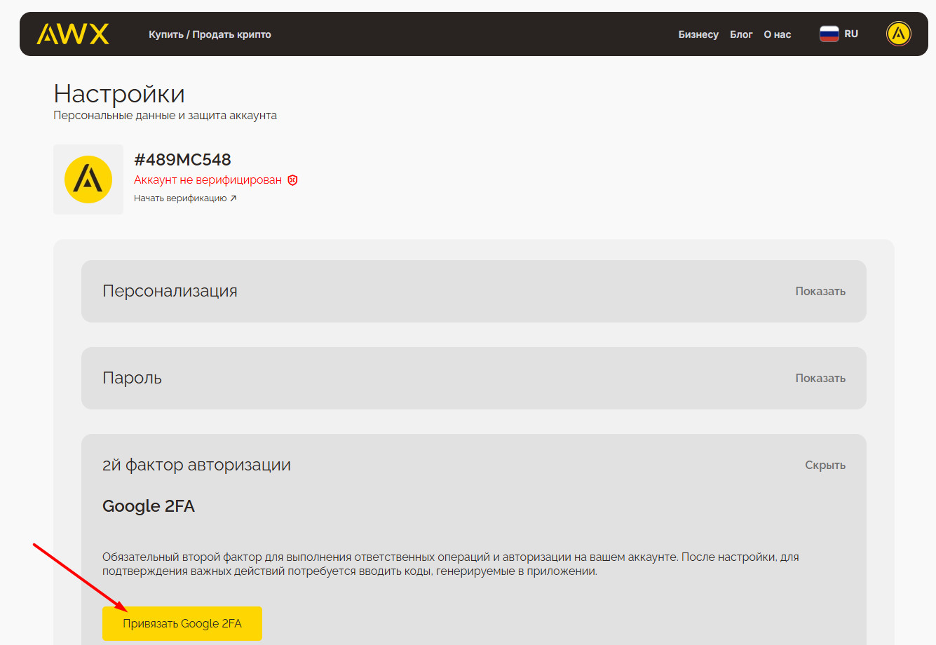 Найдите этот блок и нажмите «Показать», а затем кнопку «Привязать Google 2FA».
