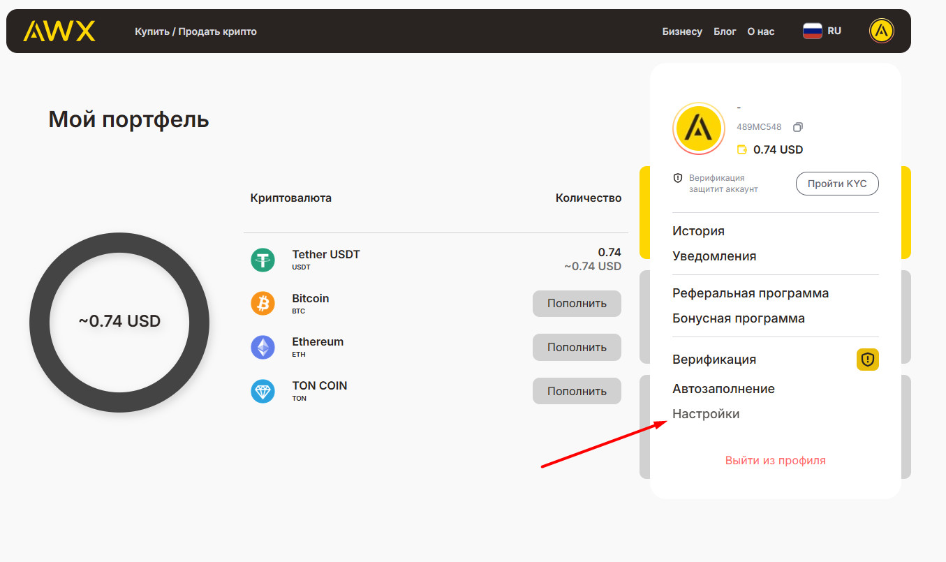 Зайдите в настройки профиля. Нажмите на иконку профиля в правом верхнем углу и выберите «Настройки».