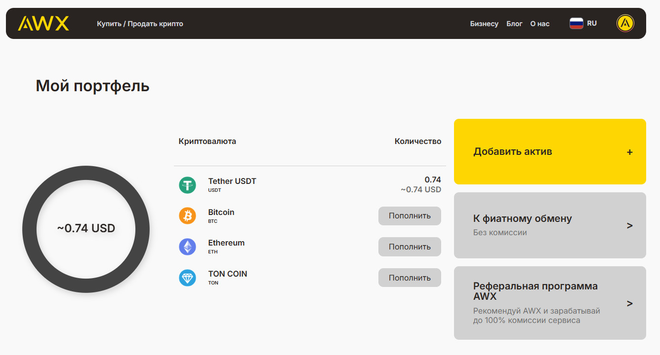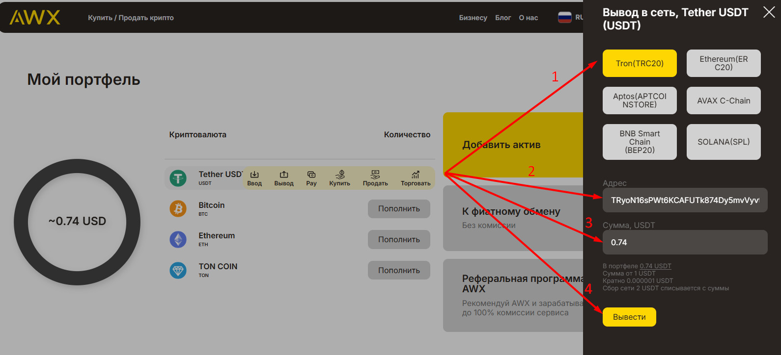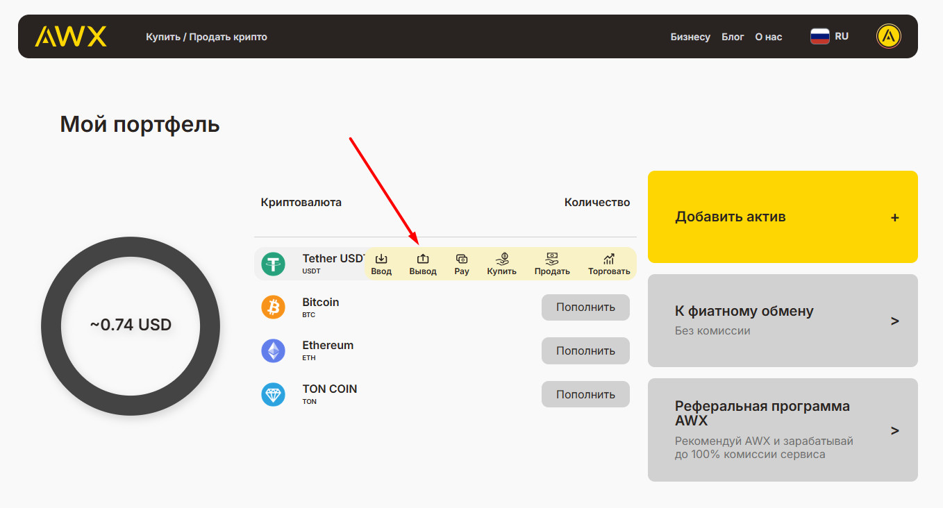 - Войдите в свой аккаунт на сервисе AWX и нажмите на название цифровой валюты, которую хотите перевести (например, USDT)