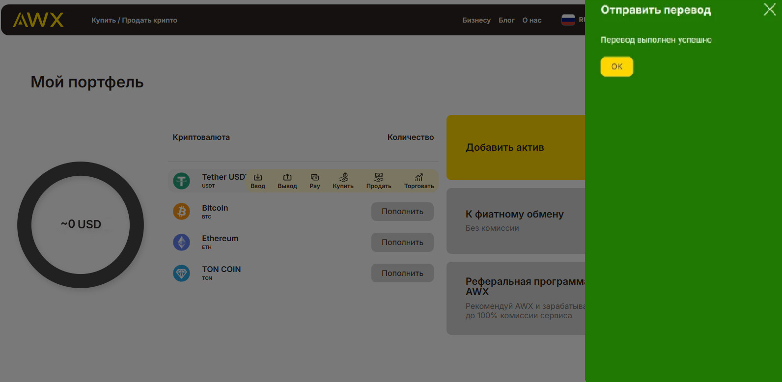 Для совершения перевода нужно иметь необходимую сумму на сервисе AWX и знать адрес кошелька получателя перевода. Нужно быть зарегистрированным и верифицированным на сервисе AWX. К Вашему аккаунту должна быть подключена Двухфакторная аутентификация (2FA).