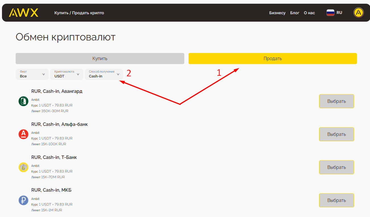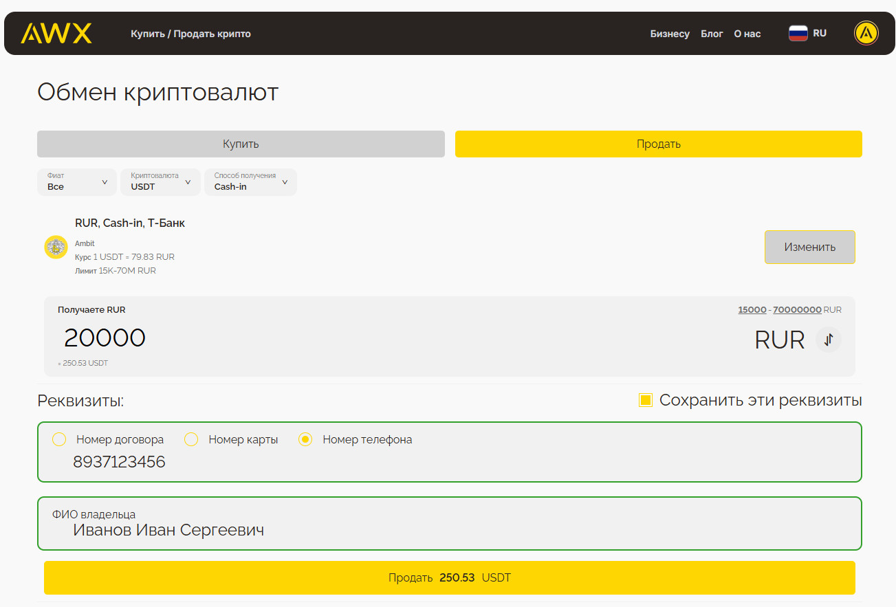 Cash In это способ продать криптовалюту и получить деньги на банковскую карту. AWX пополняет ваш счёт наличными через банковский терминал выбранного банка.