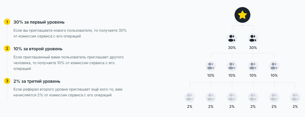 | 1-й (ваши друзья) | 30% от комиссии сервиса | 0.024% от суммы обмена |