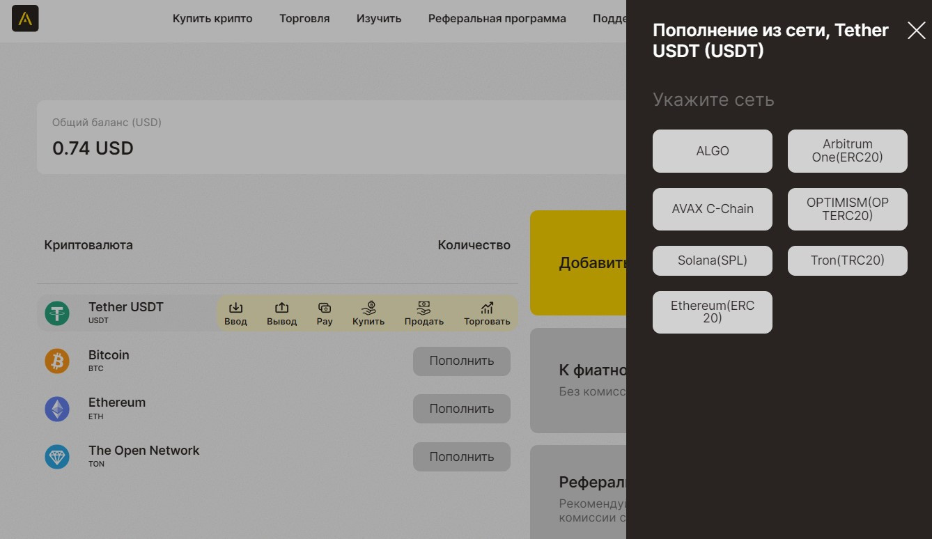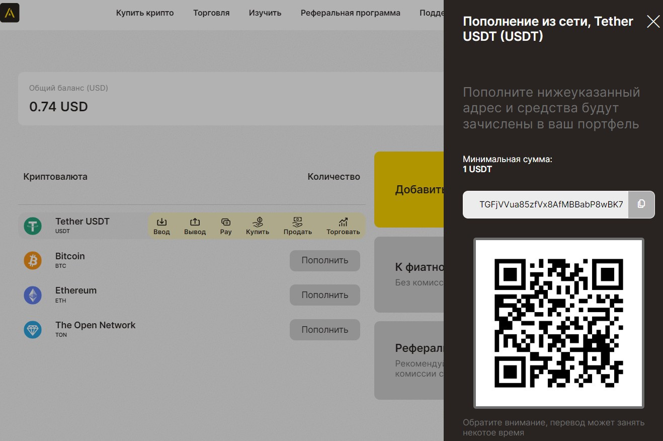 Our instructions give an example with the USDT asset and the Tron network (TRC-20), we remind you that the networks may differ when ENTERING other coins. Also, the speed of enrollment depends on the workload of the blockchain network.
