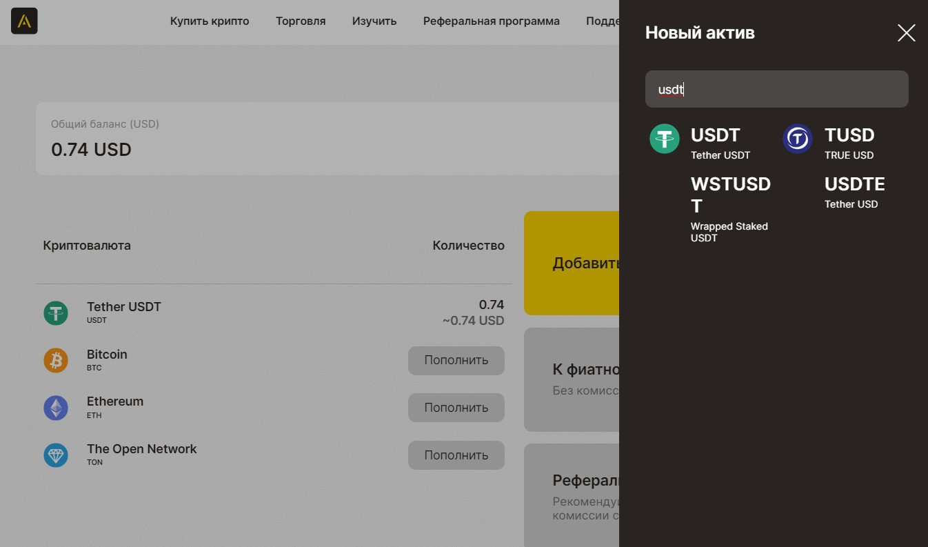 You will see a list of cryptocurrencies supported by the platform, select the one you need from the list, or use the search (the search is carried out by the ticker of the short name of the cryptocurrency, approx.: BTC, ETH, USDT).