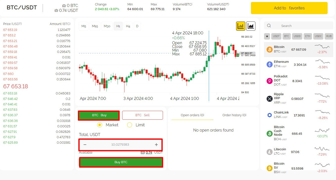 Lets look at the simplest spot deal you can make: a market order. Suppose you want to buy Bitcoin (BTC) in the amount of $5000 (USDT). To do this, you need to enter 5000 in the field «USDT Sum» and click «Buy BTC».