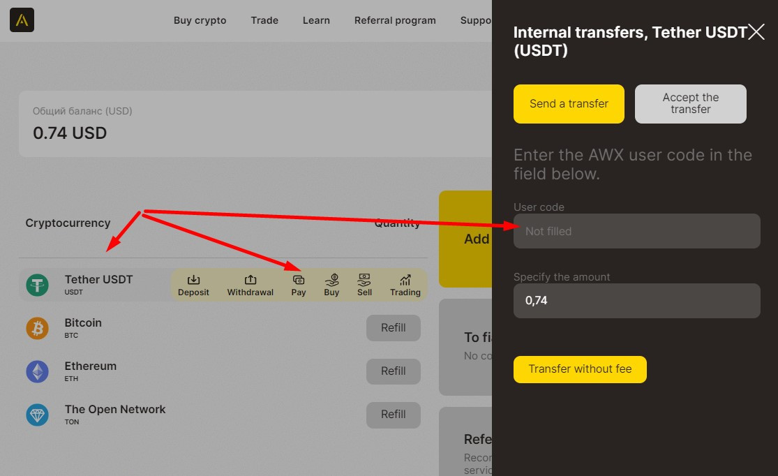 AWX internal transfers, unlike transfers via blockchain, do not have network fees (commissions) and provide instant receipt of funds.